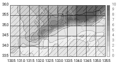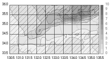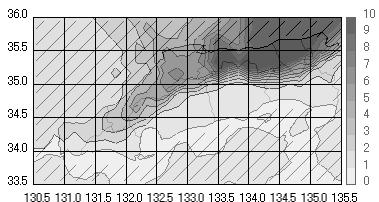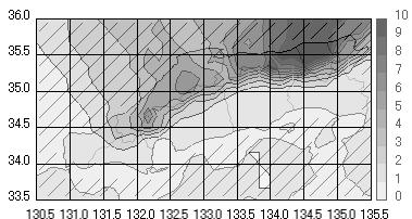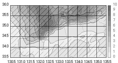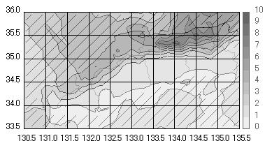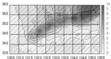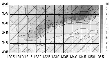 上の図は、全冬型日における中国地方での平均日降水量の分布を示しています。特徴として、