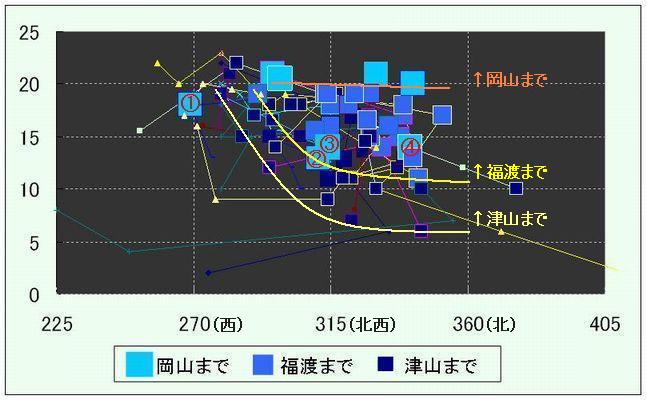 図は、1990年以降の冬型で、岡山で積雪を記録した時及び津山で20cm以上の降雪を記録した時の、米子850hPa面での風向・風速の経過を示したものです。岡山・福渡・津山それぞれまで降水が0mmを超えた時にマーカーを変えています。特徴として、