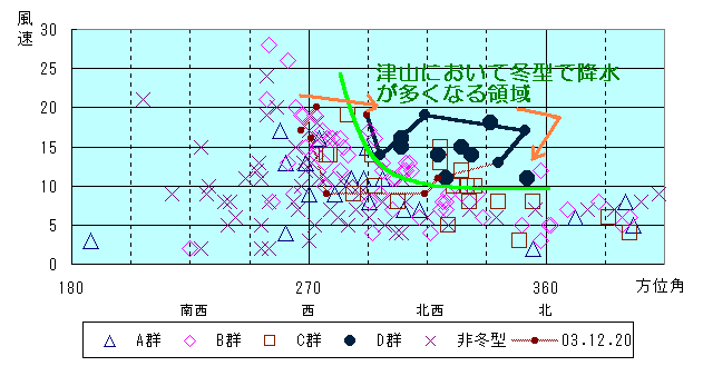 (A群は津山で降水なし、B群は津山で降水はあるが日降水量は1mm未満、C群は津山で日降水量が1mm以上4mm以下、D群は津山で日降水量が5mm以上、非冬型は冬型ではない日)