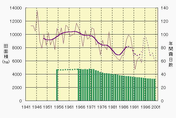 なお、盆地中心部の大気中水分(水蒸気)の減少要因について、ここでは「田面積の減少」を挙げましたが、他にも「耕地面積の減少」「緑地面積の減少」「アスファルト・コンクリート等舗装面積の増加」などが考えられます。 |