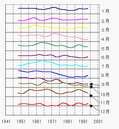 環境変化による霧日数の変化(2004.12.23UP) 津山の年間霧日数は、1970年代から減っています。 なぜ減っているか?以前、水田面積との関係を提起した論文を見かけました。 私も、なるほどと思うところがあります。 そこで、田面積と霧日数を並べてみました。 ![]() 緑棒:田面積(津山市統計書から・1985年に国土調査による面積見直しがあり、1985年より前の記録は1986年と1987年の比率を乗じて補正している) 紫細線:年間霧日数(実線は津山測候所、点線は私の記録) 紫太線:年間霧日数の前後7年間平均(実線は津山測候所、点線は私の記録が混ざる部分) 田面積も、1970年代に入って減少傾向です。いい相関がみられるようです。 一方、霧日数の減少はどの月に顕著かを調べました。 月別の霧日数の推移をみると、4・8・9月に減少が顕著です。